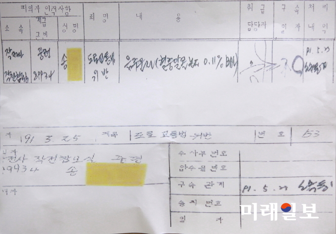 김 의원에 따르면 송 후보자는 해군 작전사령부 작전참모처 계획과장(중령)으로 재직 중이던 1991년 3월 경남 진해시내에서 만취상태로 음주운전을 하다 경찰 단속에 적발됐다. 음주운전 사실은 해군 작전사 헌병대로 이첩돼 '사건 접수부'에 기록된 것을 김 의원실이 확인한 것이다.