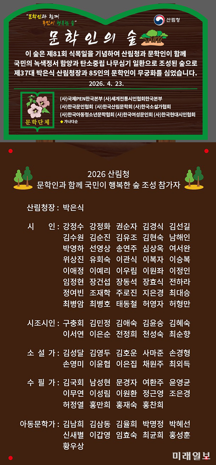 행사를 주관한 산림청의 조영희 산림복지국장은 "숲은 단순한 자원이 아니라 국민의 삶의 질을 바꾸는 가장 아름다운 기반"이라며 "특히 문학인들과 함께 조성하는 숲은 물리적 공간을 넘어, 국민의 정서와 정신을 풍요롭게 하는 문화적 숲이 될 것"이라고 강조했다.
