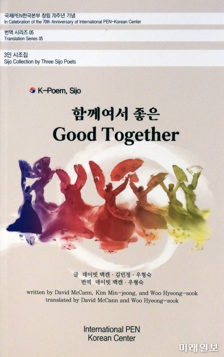 (서울=미래일보) 장건섭 기자 = 데이빗 맥캔(David McCann) 시인(번역가·전 하버드대학교 동아시아 언어문화학과 교수), 김민정 시조시인(사단법인 한국문인협회 부이사장 겸 상임이사 ), 우형숙 시조시인(번역가·사단법인 국제PEN한국본부 번역위원장)의 3인 시조집 <함께여서 좋은 Good Together>가 데이빗 맥캔·우형숙 번역으로 국제PEN한국본부 창립 70주년 기념 번역 시리즈 05권으로 신아출판사를 통해 발간되었다.출간 당시 오경자 전 국제PEN한국본부 이사장 권한대행(시인)은 "본 시조집은 국제PEN한국본부 창릭 70주년 기념으로 발간된 것"이라며 "국제PEN헌장에 명시 되어 있는 것처럼 문학은 국경을 초월한다"라고 말했다.