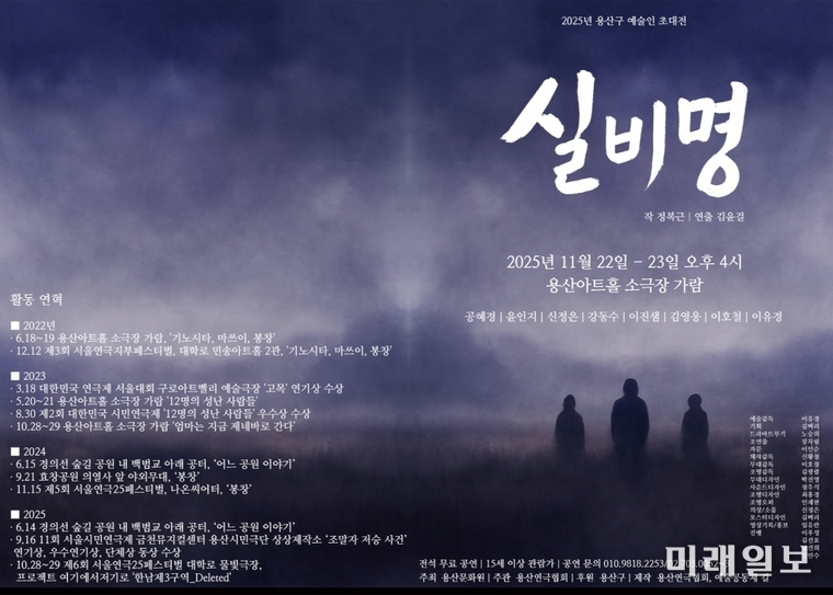 (서울=미래일보) 장건섭 기자 = 용산연극협회가 선보이는 연극 <실비명>이 오는 11월 22일부터 23일까지 오후 4시, 용산아트홀 소극장 가람 무대에 오른다. 이번 공연은 '2025년 용산구 예술인 초대전'의 일환으로, 지역 예술인의 창작 역량을 한층 더 확장하는 의미 있는 무대다.