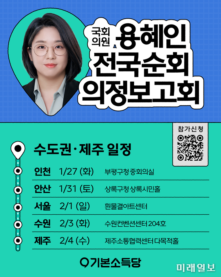 이번 의정보고회는 <국민과 함께 한 걸음 더>를 주제로 열리며, 사전 신청 없이 누구나 참석할 수 있다. 일정은 ▲1월 27일 오후 7시 인천 부평구청 중회의실 ▲1월 31일 오후 2시 안산 상록구청 상록시민홀 ▲2월 1일 오후 2시 서울 흰물결아트센터 아트홀 ▲2월 3일 오후 7시 수원컨벤션센터 204호에서 진행된다.