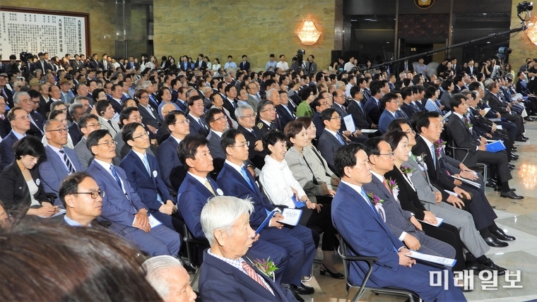 (서울=미래일보) 장건섭 기자 = 문희상 국회의장이 17일 "개헌은 반드시 이뤄내야 할 시대적 과제"라며 여야에 결단을 촉구했다.문 의장은 이날 오전 국회 로텐드홀에서 거행된 제71주년 제헌절 경축사에서 "20대 국회 임기가 1년도 남지 않았지만, 제왕적 대통령제를 바꿔야 한다는 촛불 민심에 아직도 대답하지 못하고 있다"고 지적했다.