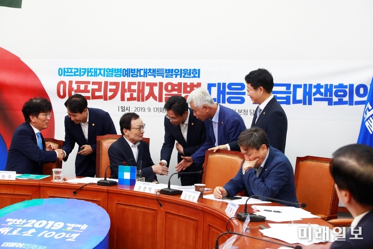조정식 정책위의장도 "앞으로 일주일간이 추가 확산 차단의 성패를 가르는 골든타임이다"라고 강조했다. 이어 "지난 6월에 아프리카돼지열병 특별위원회를 구성해 사전예방책을 강구해왔는데 안타깝게도 발병했다"며 "관과 민이 협력해 오히려 지나치다는 말이 나올 정도로 총력 대책을 추진해야 한다"고 강조했다.또 "신속한 역학조사를 통해 방역조치와 국경 검역도 철저히 해 바이러스가 추가 유입되지 않도록 차단해야 한다"고 주문했다. 지자체를 향해서는 "원활한 방역과 특별교부세 등도 적극 검토해야 한다"며 "자유한국당 등 야당도 빨리 국회로 돌아와 방역대책을 논의할 수 있길 바란다"고 야당의 협력을 촉구했다.
