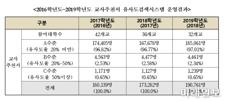 (서울=미래일보) 장건섭 기자 = 김병욱 더불어민주당 의원(성남시 분당을)이 한국대학교육협의회로부터 제출받은 '교사추천서 유사도검색시스템 운영결과'에 따르면 2019학년도 교사추천서 유사도율 20%이상 50%미만인 B수준은 4,461명, 유사도율 50%이상인 C수준은 1,239명이었다.최근 3년간 교사추천서 유사도검색시스템 운영결과를 살펴보면 2017학년도 B수준(유사도율 20%~50% 미만)은 4,563명, C수준(유사도율 50% 이상)은 1,171명으로 모두 5,734명였으며, 2018학년도는 B수준 4,477명, C수준 1,127명으로 5,604명, 2019학년도는 B수준 4,461명, C수준 1,239명으로 5,700명으로 다소 증가하고 있다.