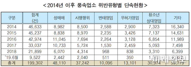지난 2014년 이후 풍속업소 단속건수는 총 19만 9천 302건으로 위반유형별로 살펴보면 성매매가 4만 8천 110명으로 가장 많았으며, 사행행위(3만 7천 242건), 청소년 상대영업(3만 974건) 순으로 나타났다.