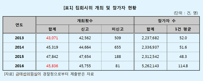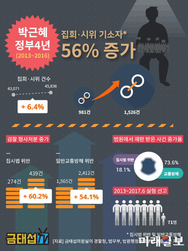 (서울=미래일보) 장건섭 기자 = 박근혜 정부 4년간 집회시위 관련 사법처리가 크게 증가한 것으로 확인됐다.금태섭 더불어민주당 의원이 경찰청, 법무부, 대법원으로부터 제출받은 자료에 따르면 집회와 시위는 2013년 4만 3,071건에서 2016년 4만 5,836건으로 6.4% 증가[표1]한 동안 검찰에서 집시법 위반, 일반교통방해를 이유로 한 형사처분은 각각 60.2%(274건→439건), 54.1%(1,565건→2,412) 증가했으며[표2][표2-1], 법원에서 재판을 받은 사건은 각각 18.1%(215건→254건), 73.6%(591건→1,026건)가 늘어났다[표3][표3-1].
