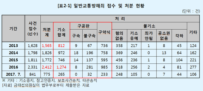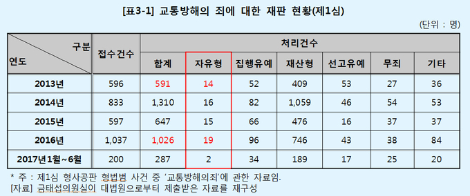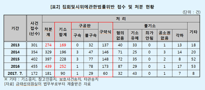 같은 기간 집시법 위반, 일반교통방해를 이유로 기소된 경우는 56%(981건→1,526건)가 증가[표2][표2-1]했으며 71명에 대해 실형이 선고됐다[표3][표3-1].한편 박근혜 대통령의 탄핵 전후에서 올 7월까지는 집시법 위반, 일반교통방해를 이유로 한 형사처분 및 재판이 크게 감소한 것으로 확인됐다. 금태섭 의원은 "지난 4년간 박근혜 정부는 집회 및 시위에 대해 과잉진압과 엄격한 사법처리로 일관해 헌법상 기본권을 침해했다"며 "촛불집회를 계기로 평화적 집회 문화가 정착된 만큼 집회 및 시위의 자유가 최대한 보장되도록 공권력의 인식 전환이 필요하다"고 말했다.
