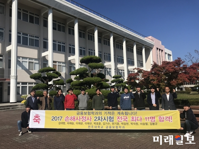 (전주=미래일보) 이중래 기자 = 전주대학교 경영대학 금융보험학과는 제40회 손해사정사 2차시험에서 11명이 최종합격, 전국 10여개 보험관련 학과가 있는 대학 중 21년째 1위를 차지했다고 6일 밝혔다.손해사정사는 보험사고로 인한 손해액 및 보험금을 산정하는 전문가로서 법률상 손해사정업무를 하는 회사 직원 3명 중 한 명은 이 자격이 있어야 하며, 또한 이 자격을 취득하면 삼성, 현대, 동부 등 대기업에 고액의 연봉을 받고 취업하게 되므로 대학을 진학하는 신입생들에게 인기 있는 학과로 있다.