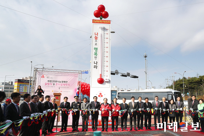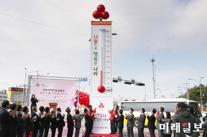 (무안=미래일보) 이중래 기자 = ‘나눔 실천으로 사랑의 행복 온도탑 수은주를 올려 추운 겨울을 녹여주세요.’20일 목포 옥암동 도청 입구 사거리에서 ‘나눔으로 행복한 나라’라는 슬로건 아래 ‘희망2018나눔캠페인’ 출범식과 함께 사랑의 행복온도탑 제막식이 열렸다.