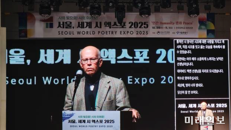 '서울, 세계 시 엑스포 2025'가 진행 중이던 지난 30일, 서울 광진구 건국대학교 새천년관에서 김소월의 '진달래꽃'이 또렷한 한국어 발음으로 울려 퍼졌다. 시를 낭송한 이는 다름 아닌 데이비드 매캔 미국 하버드대 명예교수였다.