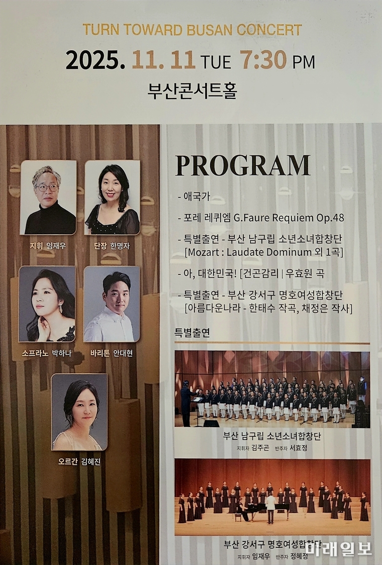 무대에는 소프라노 박하나, 바리톤 안대현, 오르간 김혜진이 특별출연하며, 시민합창단을 비롯해 아첸투스 챔버 오케스트라, 부산남구립소년소녀합창단, 부산강서구명호여성합창단이 함께 출연해 웅대한 합창의 감동을 선사한다. 세대를 초월한 이들의 목소리는 전쟁의 비극을 넘어, 평화로 나아가는 인류의 화음을 완성할 것으로 기대된다.