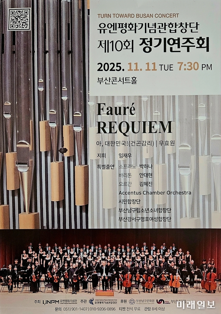 (부산=미래일보) 장건섭 기자 = 유엔평화기념관합창단(단장 한명자)이 오는 11월 11일 오후 7시 30분, 올해 개관한 부산콘서트홀(예술 총감독 정명훈)에서 제10회 정기연주회 'TURN TOWARD BUSAN CONCERT'를 개최한다.