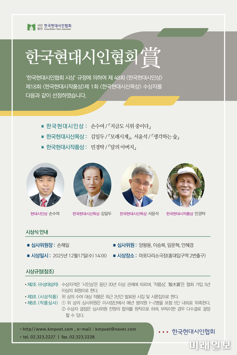(서울=미래일보) 장건섭 기자 = 국내 대표 시단 단체인 사단법인 한국현대시인협회(이사장 제갈정웅)가 오는 12월 17일(수) 서울 마포구 청년문화공간 다리소극장에서 '2025 세미나·시상식·출판기념회'를 연다.