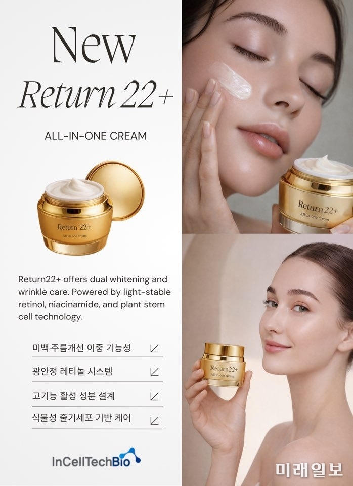 'Return22+'는 광안정 레티놀과 나이아신아마이드, 식물성 줄기세포 기반 기술을 적용한 제품으로, 미백과 주름 개선 이중 기능성을 갖춘 것이 특징이다.