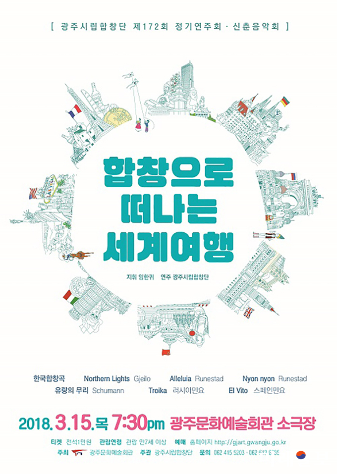 (광주=미래일보) 이중래 기자 = 광주시립합창단은 오는 15일 오후 7시 30분 광주문화예술회관 소극장에서 제172회 정기연주회 ‘신춘음악회-합창으로 떠나는 세계여행’을 선보인다.우리나라 곡은 물론 독일, 이탈리아, 러시아, 노르웨이, 중국, 미국 등 각국의 민요, 오페라, 종교, 현대음악을 다양한 합창곡을 선보인다. 특히 임한귀 상임지휘자가 지휘와 해설을 맡아 색다른 즐거움을 선사한다. 각 나라별 음악에 얽힌 배경과 곡 해설이 더해지면서 공연의 재미와 의미를 더할 것이다.