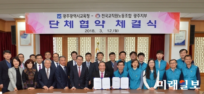 (광주=미래일보) 이중래 기자 = 광주시교육청과 전국교직원노동조합 광주지부가 6년 만에 단체협약을 체결했다.12일 광주시교육청에 따르면 이날 오후 4시 장휘국 교육감과 정성홍 광주지부장 등 30여 명이 참석한 가운데 ‘2017 단체협약’을 체결했다. 특히 이번 단체협약은 지난 2013년 정부가 해직자를 구성원으로 두고 있다는 이유로 전교조에 ‘법상 노조 아님’을 통보한 이후 처음 체결된 것이며, 2012년 단체협약 이후 6년 만이다.