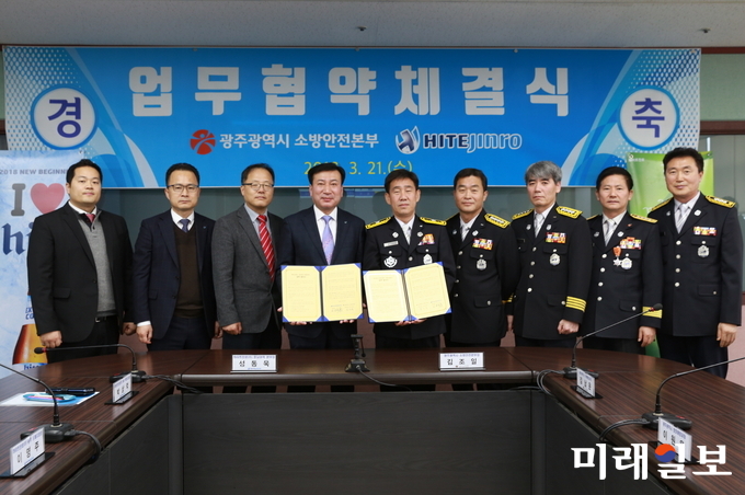 (광주=미래일보) 이중래 기자 = 광주광역시 소방안전본부는 21일 21일 시청 17층 재난대책회의실에서 하이트진로(주)와 업무협약을 하고 재난예방과 상생발전을 위해 손을 잡았다. 이번 협약식에는 김조일 시 소방안전본부장, 성동욱 하이트진로(주) 호남권역 본부장 등 20여 명이 참석했으며 상호 재난예방을 위한 협력을 강화해나가기로 했다.