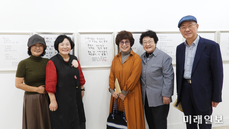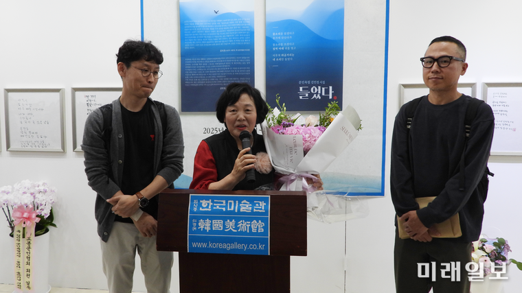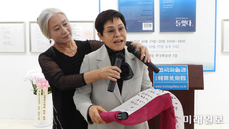 행사장 안에는 축화환 대신 문인들의 필체가 빛을 더했다. 한쪽 벽면에는 '시와 손이 만나는 자리'라는 문구가 적혀 있었고, 그 아래에는 "물소리를 읽겠다고/ 문가에 앉았다가// 물소리를 쓰겠다고/ 절벽 아래 귀를 열고// 사무쳐 와글거리는/ 내 소리만 들었다."는 김 시인의 <들었다> 표제 작 친필 글귀가 걸려 있었다.관람객들은 시와 필체를 동시에 감상하며 '문학의 시각적 예술성'을 경험했다. 잉크 냄새가 은은히 남은 공간은 마치 문학의 숨결이 머무는 서재 같았다.