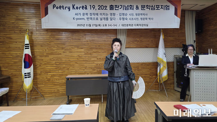 첫 번째 발표자로 나선 김명순 시인(영문학 박사, 대전문인총연합회 회장)은 'AI가 문학 창작에 미치는 영향'을 주제로 발표했다.김명순 박사는 "AI가 문학을 자동화하는 존재가 아니라, 창작의 기초 자료를 확장하고 시인의 내면을 더 깊게 들여다보는 촉매 역할을 할 수 있다"고 설명했다.