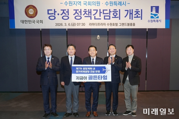 (수원=미래일보) 이연종 기자 = 이재준 수원 특례시장이 지역 국회의원들과 정책간담회를 열고 경기국제공항 추진을 비롯한 수원시 주요 현안에 대한 협력 방안을 논의했다.이 시장은 6일 라마다프라자 수원호텔에서 열린 당·정 정책간담회에서 "정부가 수립하는 제7차 공항개발 종합계획에 '경기국제공항' 건설 내용이 반영될 수 있도록 국회 차원의 협력이 필요하다”며 “경기도와의 협의에도 적극 힘써 달라"고 요청했다.