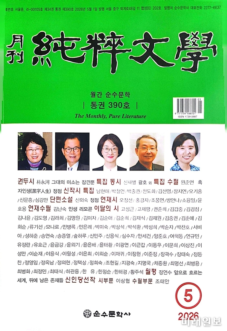 (서울=미래일보) 장건섭 기자 = 빠르게 읽히고 쉽게 잊히는 시대, 월간 <순수문학> 2026년 5월호(통권 390호)는 '문학의 속도'를 의도적으로 늦춘다.